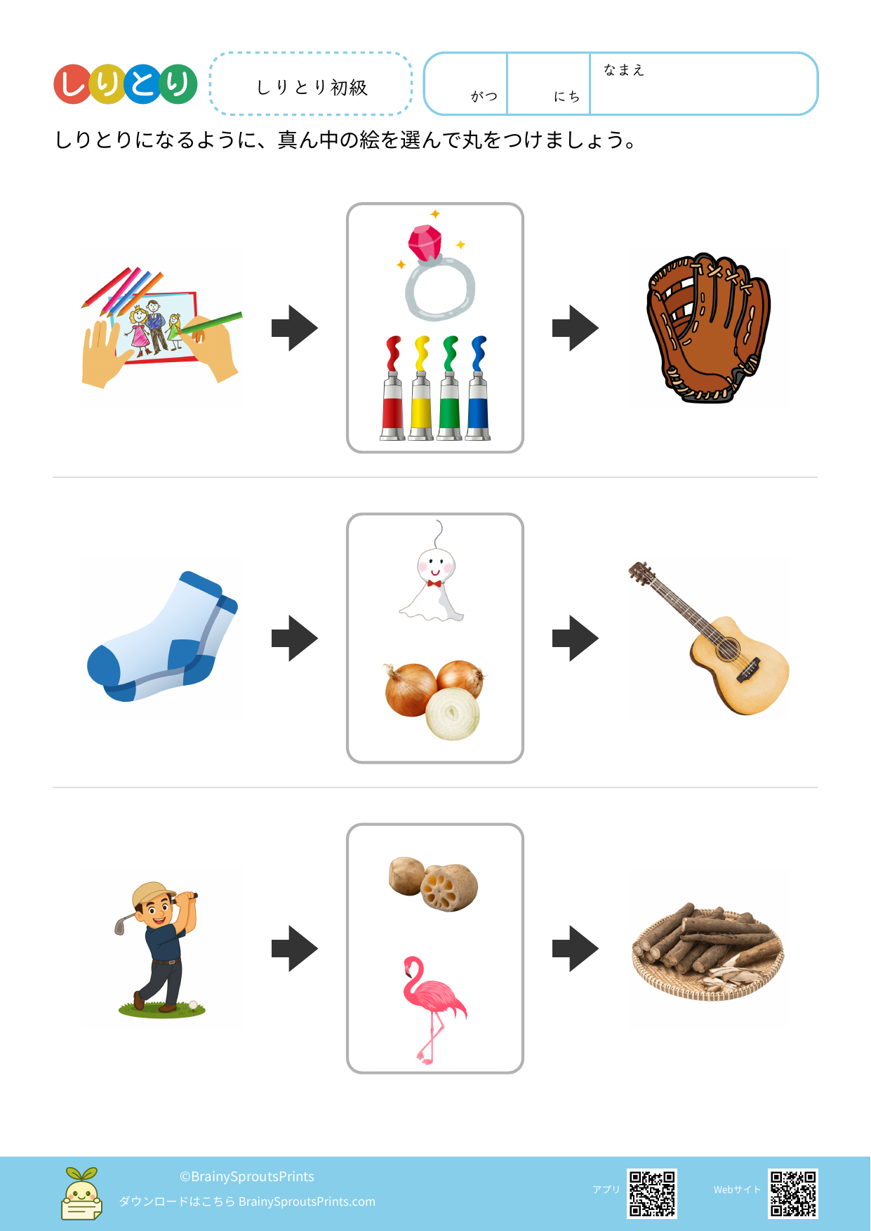 ことばのつながりを考えながら、語彙を広げやすいプリントです。正解を出すだけでなく、どんな言葉を思いついたかをたどることで、今ある語彙の量や偏りも見えやすくなります。 しりとりは遊びに見えますが、音への意識や語彙の引き出しを使う練習として相性のよい活動です。