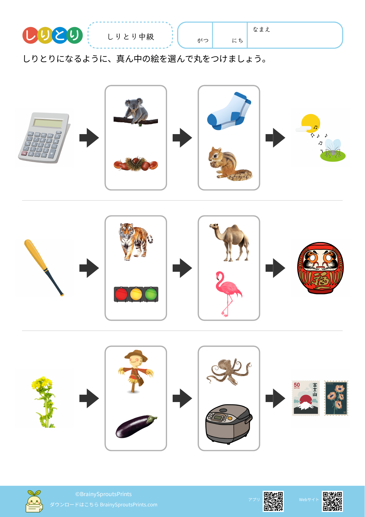 ことばのつながりを考えながら、語彙を広げやすいプリントです。正解を出すだけでなく、どんな言葉を思いついたかをたどることで、今ある語彙の量や偏りも見えやすくなります。 しりとりは遊びに見えますが、音への意識や語彙の引き出しを使う練習として相性のよい活動です。